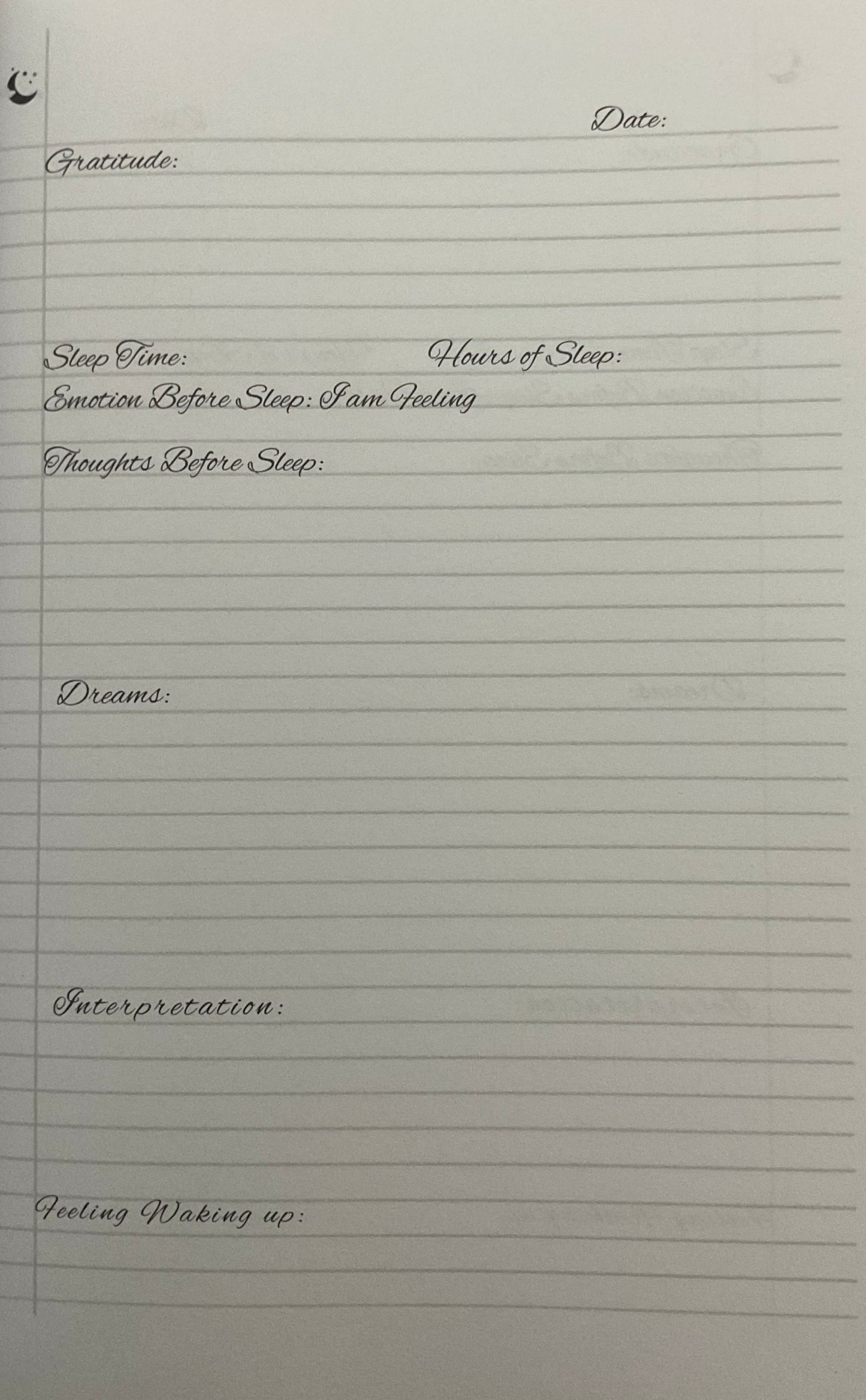 A journal to help you sleep with a sleep health journal to help your nightly routine. This journal has space ti write your dreams to analyze them later on. A journal sleep health to improve your sleep quality and hopefully makes you feel more refreshed in the morning by understanding what is disturbing your night. A sleep and health journal starts with one night at a time.